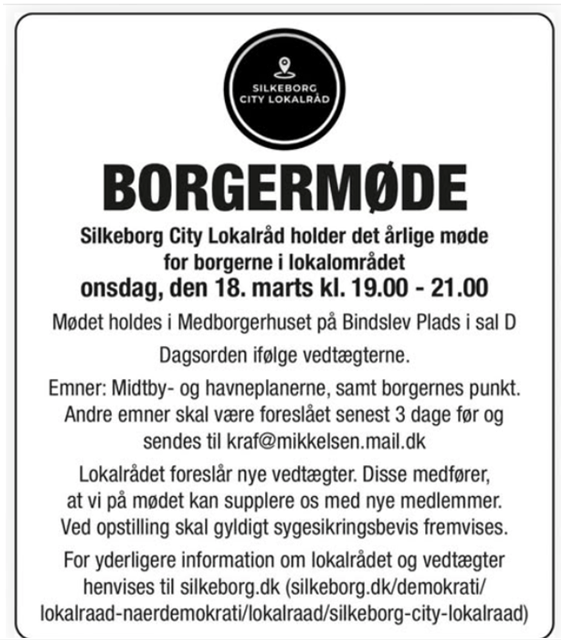 Men Silkeborg City Lokalråd har besindet sig og afholder den 18, marts kl. 19 i Medborgerhuset Borgermøde. Det fremgår af rådets facebook-.side og en annonce i MJA. Men lokalrådet følger fortsat ikke vedtægterne, idet de skriver, at på mødet kan suppleres med nye medlemmer. Fakta er at ingen af Lokalrådets medlemmer er demokratisk valgt! Derfor opfordrer undertegnet dig til at møde frem og blive den stemme for politikerne, som de gerne vil have.